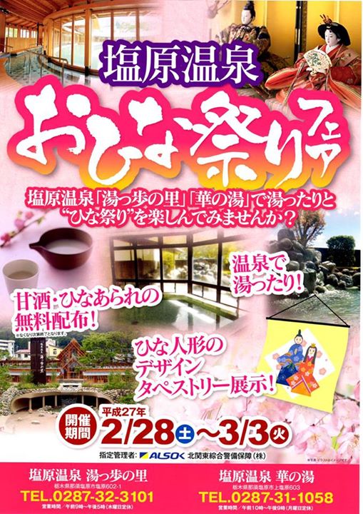 本日より3日間、足湯公園「湯っ歩の里」と、日帰り入浴施設「華の湯」にて<おひな祭り>開催! 那須塩原便り2015年2月28日 本日より3日間、足湯公園「湯っ歩の里」と、日帰り入浴施設「華の湯」にて<おひな祭り>開催。甘酒・ひなあられが無料で配布されます。どうぞお出かけ下さい。詳細はこちら: http://www.facebook.com/ShiobaLove/photos/a.166422493413151.51010.162749023780498/781328645255863/?type=1 Sharing Twitter0 Facebook0 Google +0 Email Print Tags 塩原温泉郷「しおばラブ」さんのFacebookウォール