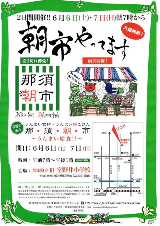 来週末6/6(土)、6/7(日)には那須町旧室野井小学校にて人気の「那・須・朝・市」開催です。那須の大きな食卓、うんまい朝ごはんをテーマに、那須地域のおいしいものが集合します。一部栃木版情報紙に今日明日(つまり5/30,5/31)開催と間違って記載されてしまいましたが、今週末でなく来週末の開催です。お日にち、お間違いのないように。塩原からはうんまいもんプロジェクトが、塩原高冷地かぶを持って参加します。