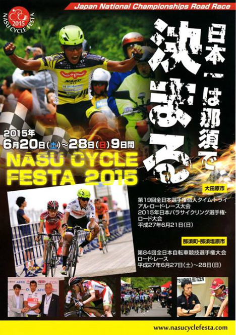 いよいよ明日6月20日(土)、大田原会場を皮切りに、28日(日)まで、大田原市、那須塩原市、那須町の三市町をエリアとする、那須サイクルフェスタ2015が始まります。第19回全日本選手権個人タイム・トライアル・ロードレース大会、第84回全日本自転車競技選手権大会ロードレース、二つのレースを中心に様々なイベントが行われます。詳細は大会HPをご覧ください。