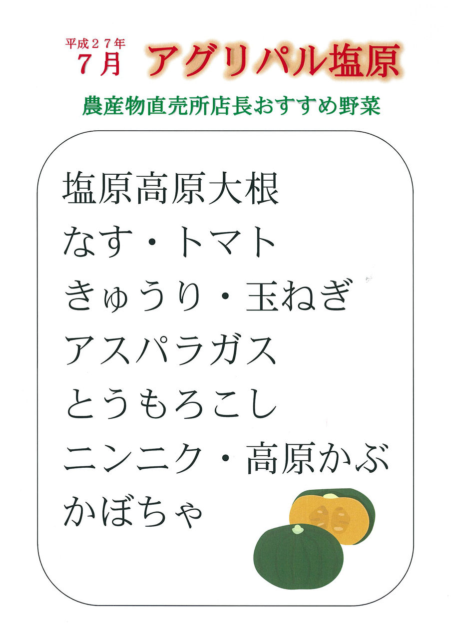 塩原高原大根・なす・トマト・きゅうり・玉ねぎ・アスパラガス・とうもろこし・ニンニク・高原かぶ・かぼちゃ