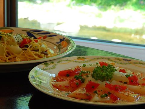 写真は塩原もの語り館2階のレストラン「洋燈(らんぷ)」の<夕顔と夏野菜のペペロンチーノ」と<夕顔のカルパッチョ」です。人気メニューになっています。