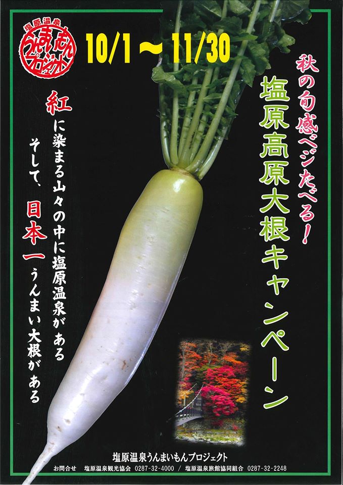 昨年に引き続き、塩原温泉うんまいもんプロジェクトが主催となり「塩原高原大根キャンペーン」を実施します。