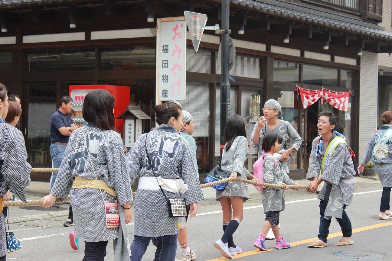 大人も子供も、同じ衣装、同じ掛け声で、一緒になって山車をひく。