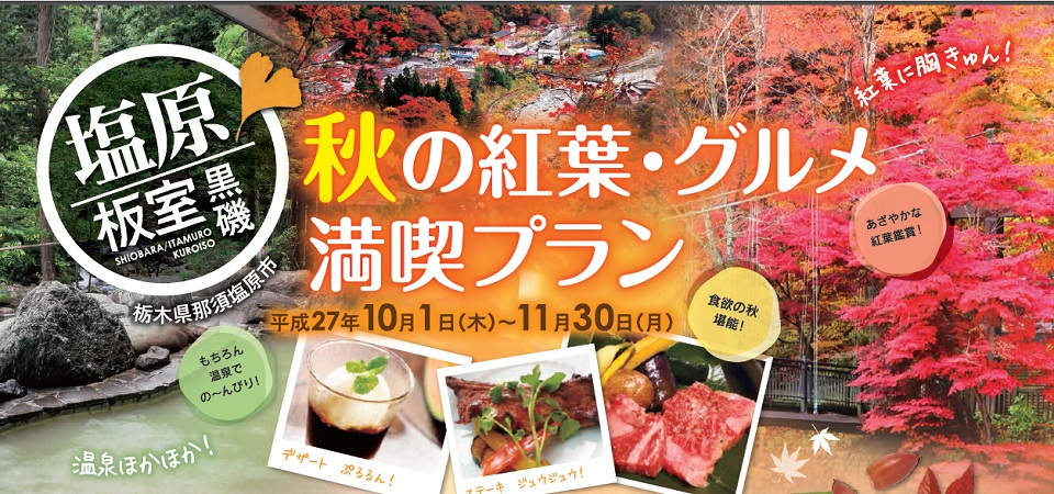この秋、塩原温泉、板室温泉では『秋の紅葉・グルメ満喫プラン』をご用意しております。