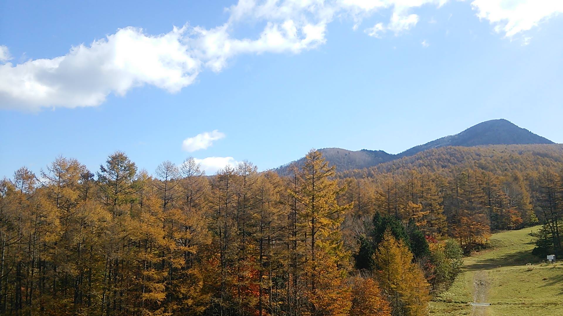 山麓から中腹にかけて、カラマツの優しい色合いの紅葉がとても綺麗な時期になりました。お天気も良く遠くの山並みまで見渡せるので最高です。ただし・・・山頂の気温は-1℃前後と冬の気温ですから暖かい服装でご来場下さいネ