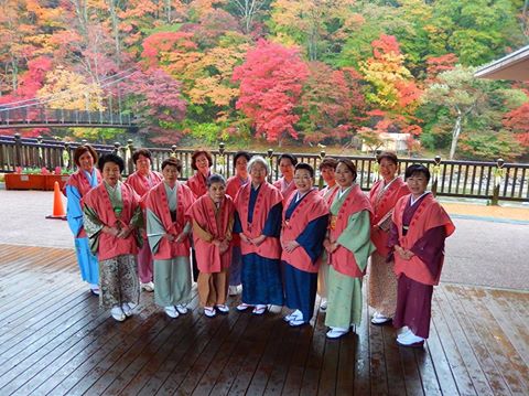 塩原温泉観光協会も入っている、塩原もの語り館裏手の紅葉が最盛期を迎えています。11月2日にこちらで塩原温泉女将の会による、温泉饅頭とお茶の振る舞いが行われ、新聞各社の取材を受けました。取材での写真撮影のためずらりと並んだ女将さんたち。紅葉との競演?