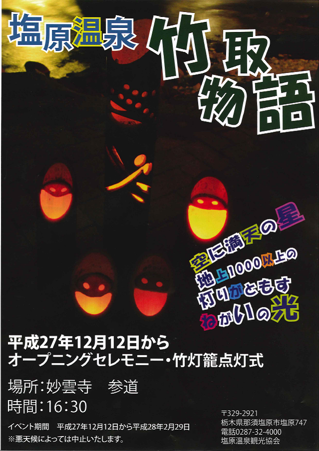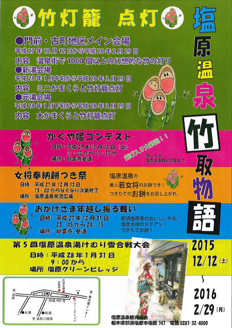 冬の塩原のイベント情報 <12/12~2/29塩原温泉竹取物語 & 12/13 女将もちつき祭> 那須塩原便り2015年12月7日 冬の塩原のイベント情報まとめです! 12/13(日)には、塩原温泉交流広場にて 女将さんたちによるお餅つき大会がありますよー!! 13:00からスタートで、なくなり次第終了です! お早めにお越しください(^-^) Sharing Twitter0 Facebook0 Google +0 Email Print