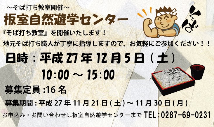 12/5 そば打ち教室のお知らせ @板室自然遊学センター 那須塩原便り2015年12月2日 【そば打ち教室のお知らせ】 ベテラン講師が丁寧に指導しますので、気軽に参加出来ます 申し込みお待ちしています。 日時 2015年12月5日(土) 10時~ 場所 板室自然遊学センター TEL 0287-69-0231 板室ダム湖カヌー体験ツアー(板室自然遊学センター)の情報・口コミを見る Sharing Twitter0 Facebook0 Google +0 Email Print