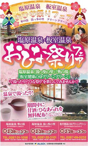 おひな祭りフェア 那須塩原便り2016年2月29日 板室健康の湯グリーングリーンで 湯ったりと『ひな祭り』を楽しんでみませんか❔ 期間中 甘酒・ひなあられ無料配布 (なくなり次第終了) 渓流釣り3月1日解禁、冷えきったら甘酒飲んで温泉はいかがでしょうか 板室健康のゆグリーングリーンの情報・口コミを見る Sharing Twitter0 Facebook0 Google +0 Email Print