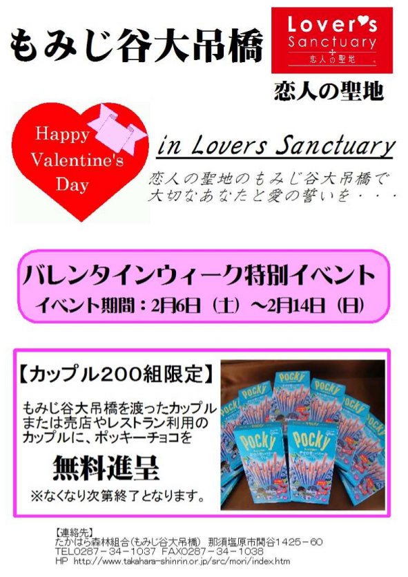 「恋人の聖地」もみじ谷大吊橋を渡ったカップルまたは売店やレストランを利用したカップルに 「幸せを運ぶポッキー。幸せの青いベリーポッキー〈ハートフル〉」を限定200組にプレゼントします!