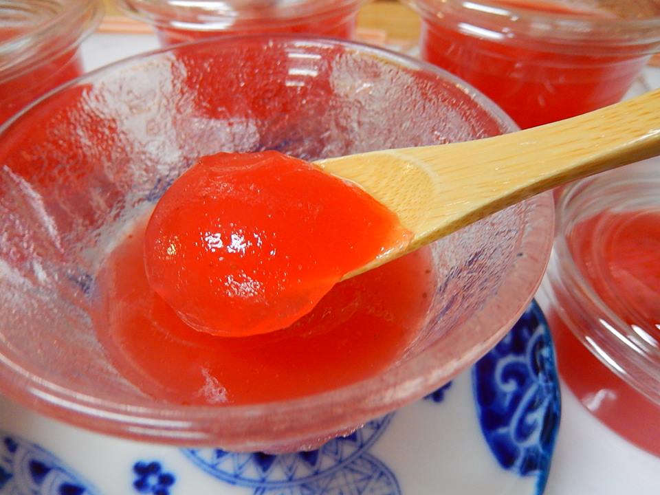 餃子の後はさっぱりとお口直しを。塩原の農家の方が作るスカイベリー苺のとろとろゼリーできました!中に低温ローストで甘みとジューシーさと風味を閉じ込めた苺が半分ずつ入って200円の大特価です。