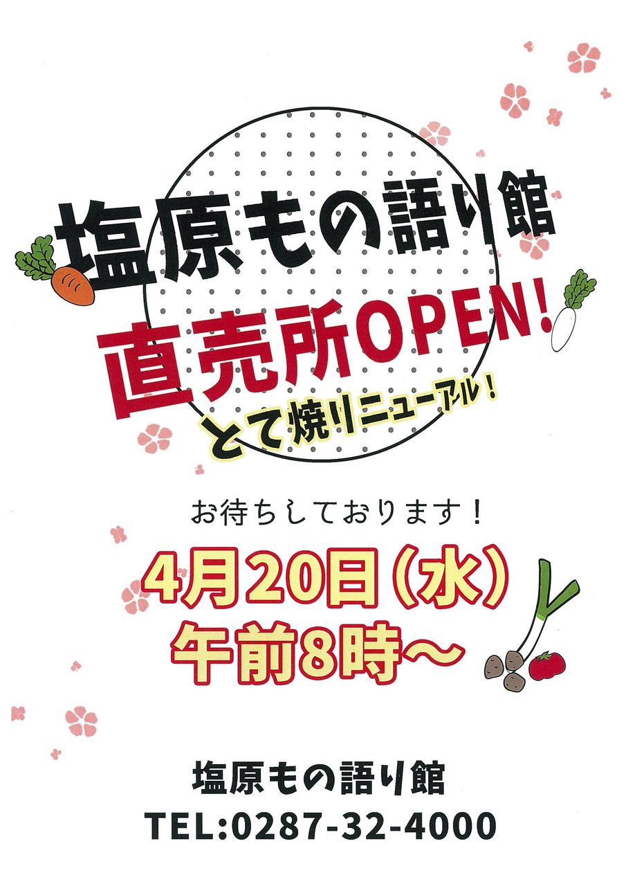 塩原もの語り館の直売所が、長い冬季休業を終えて平成28年4月20日(水)から今年の営業をスタートします。