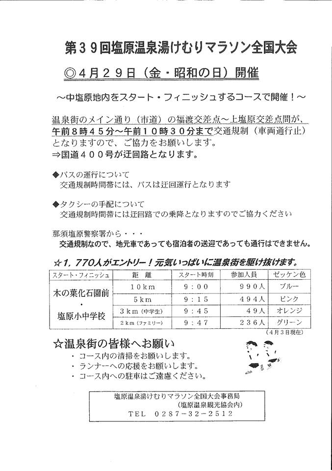 4/29 塩原温泉湯けむりマラソン大会に伴う交通規制