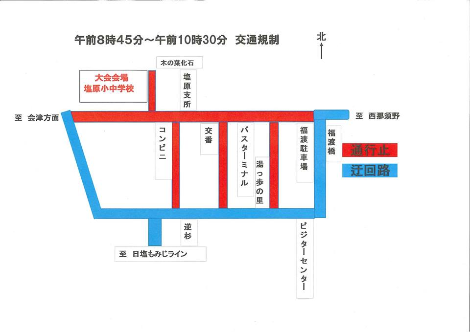 福渡橋交差点から上塩原宮島までの温泉街が通行止めになりますのでご注意ください。