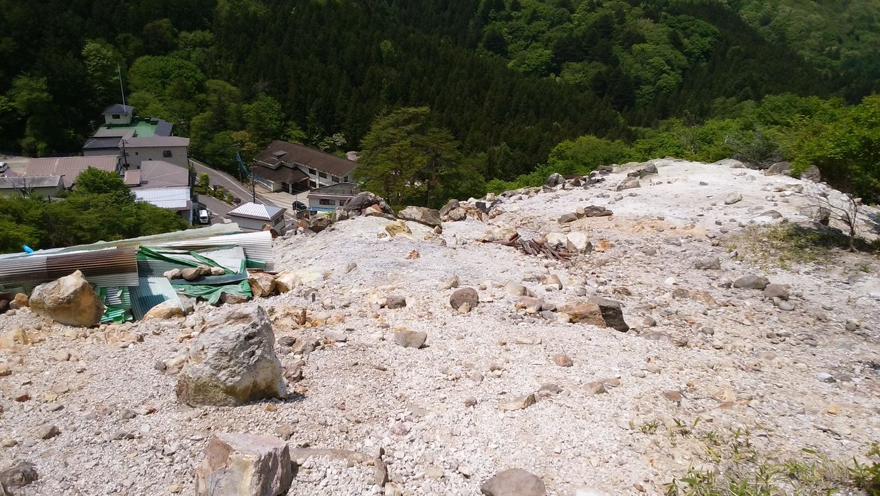 硫黄の匂いが立ち込め、下まで植物の全くない景色が見られます。