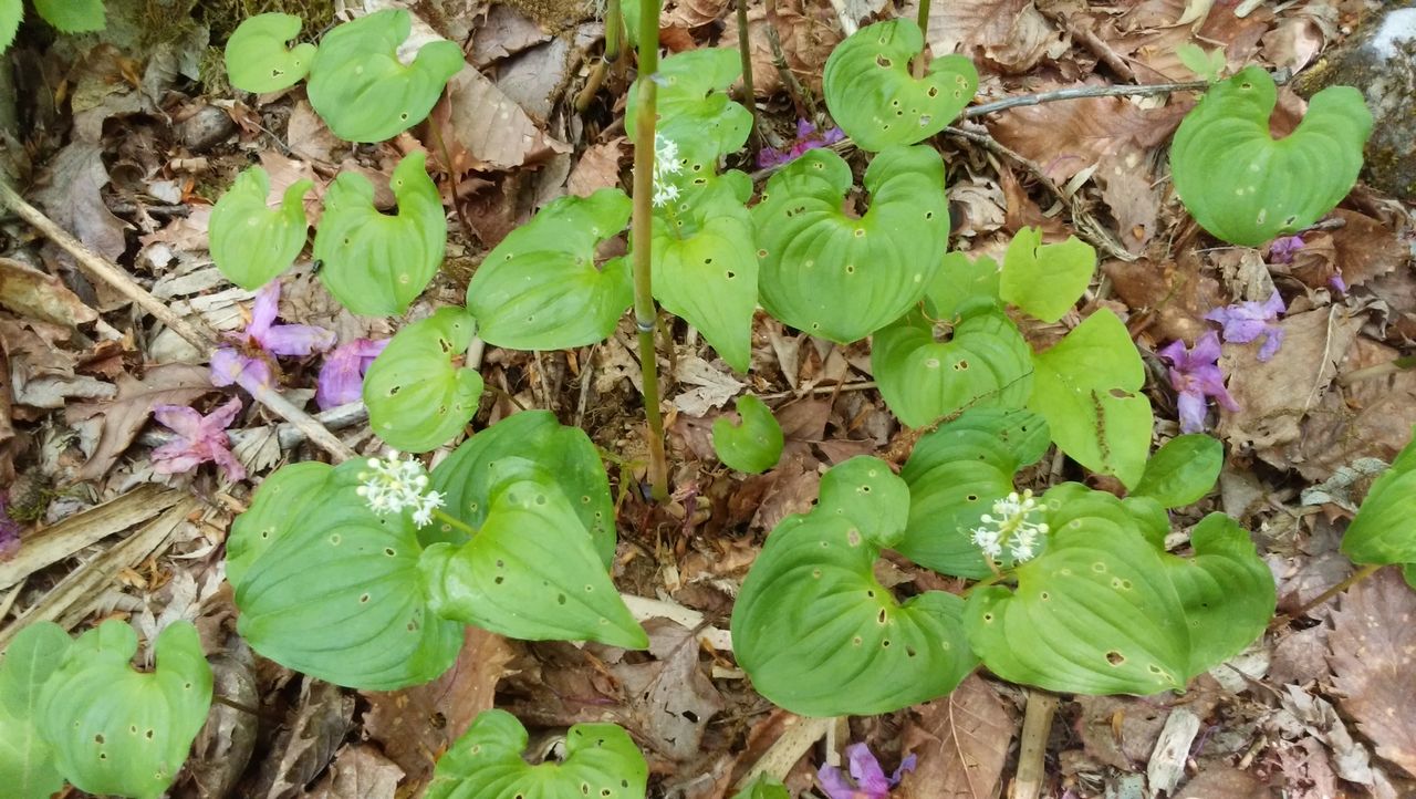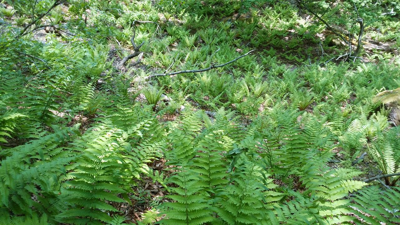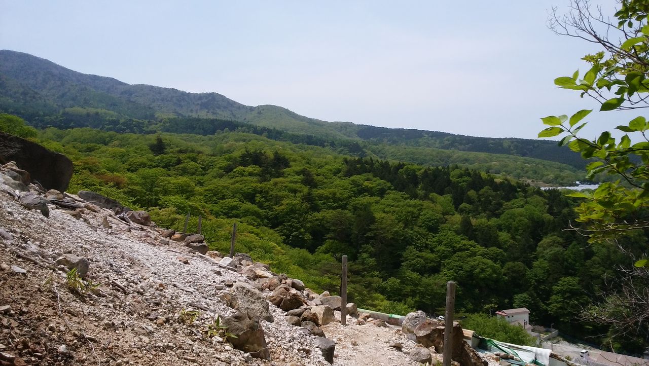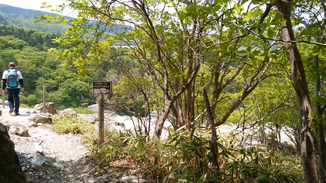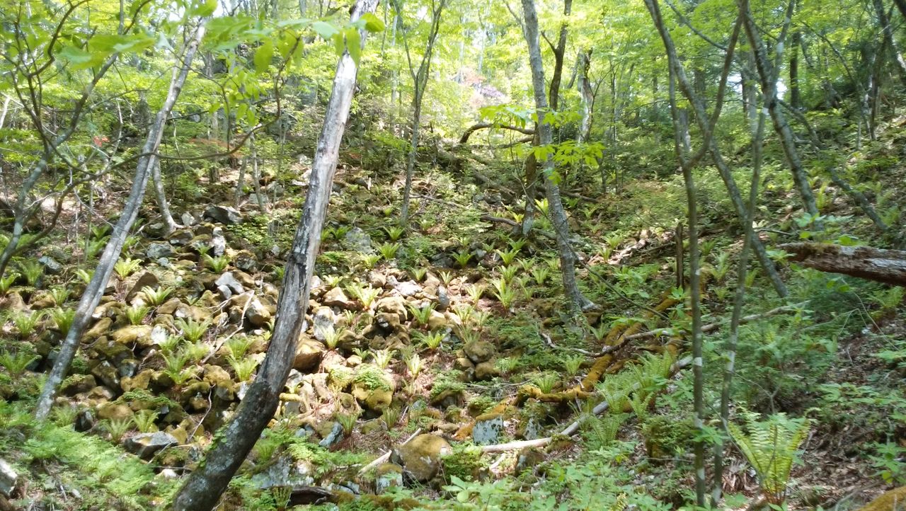 東側はゴロゴロとした溶岩石が多い急斜面で、少し登るとゆるやかな広葉樹林、山頂から西に下りるとオシダの群生地帯があり、街路樹とは比較にならない大きさの天然の栃の木、さらに下りると新湯爆裂火口の赤茶けた地肌が見えます。