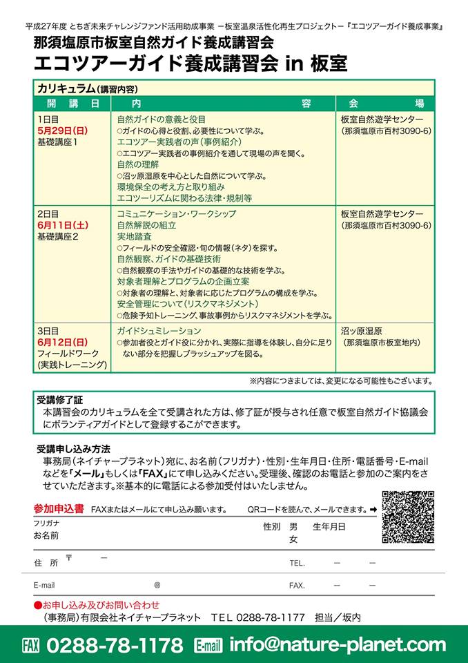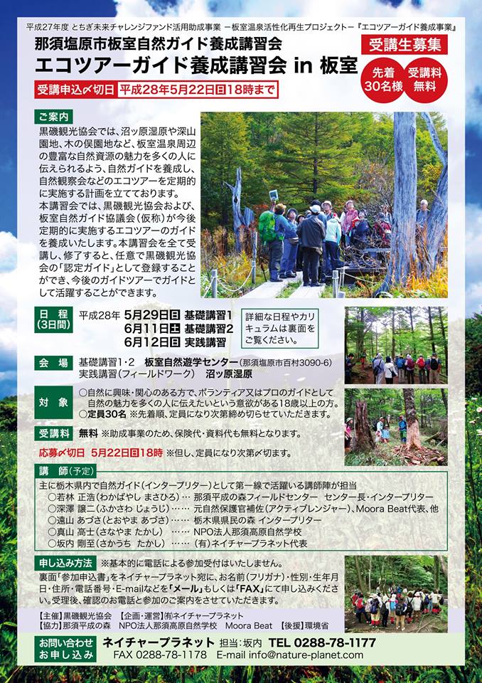 この度、平成27年度とちぎ未来チャレンジファンドの助成を受け、黒磯観光協会および、板室自然ガイド協議会(仮称)が今後定期的に実施するエコツアーのガイドを養成いたします。本講習会を全て受講し、修了すると、任意で黒磯観光協会の「認定ガイド」として登録することができ、今後のガイドツアーでガイドとして活躍することができます。