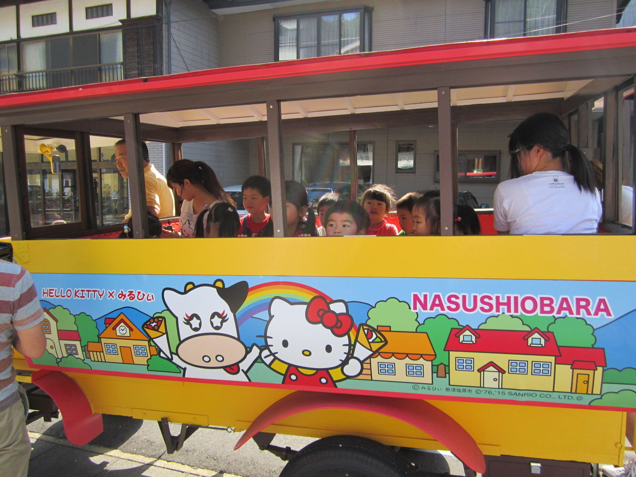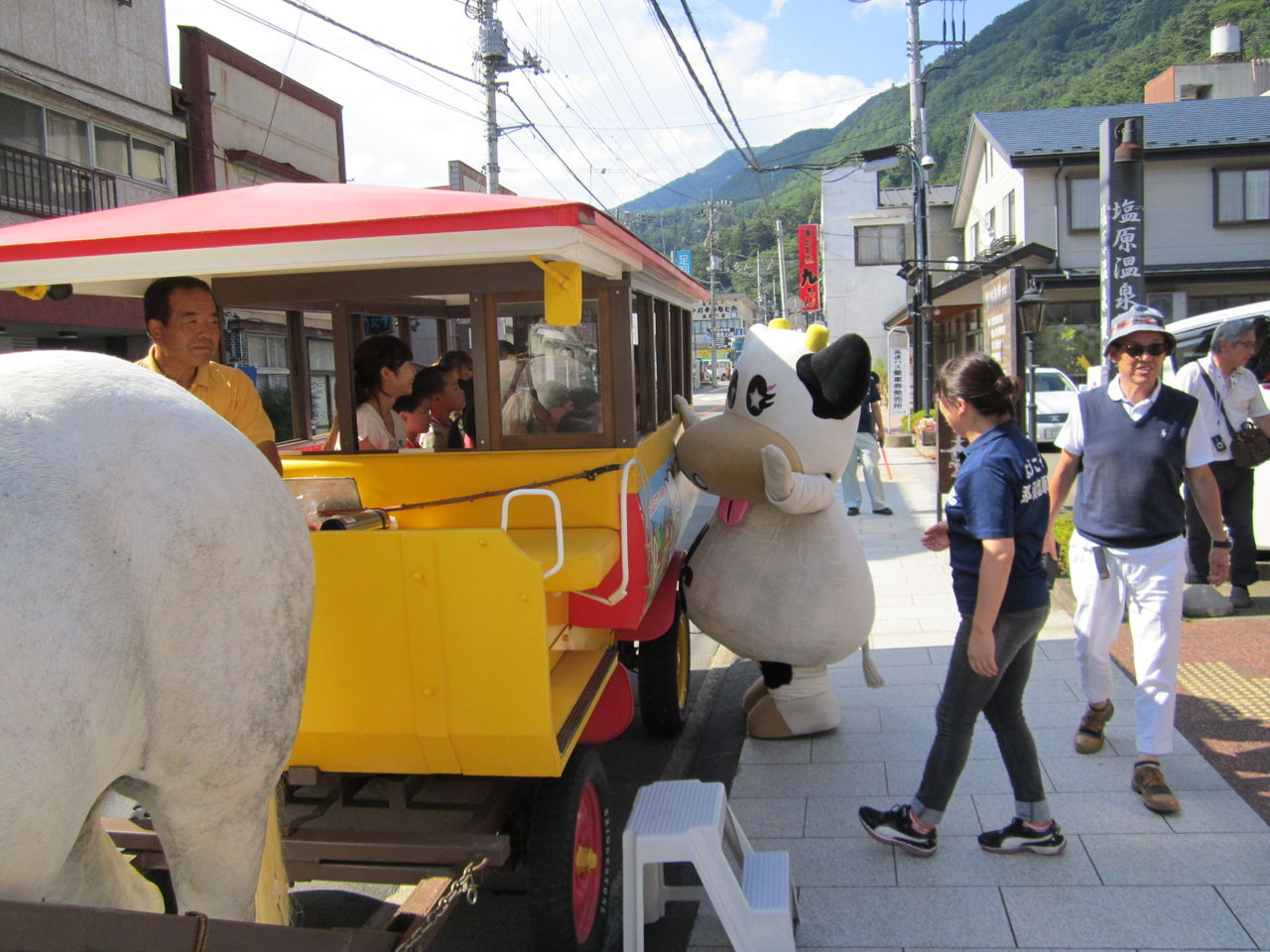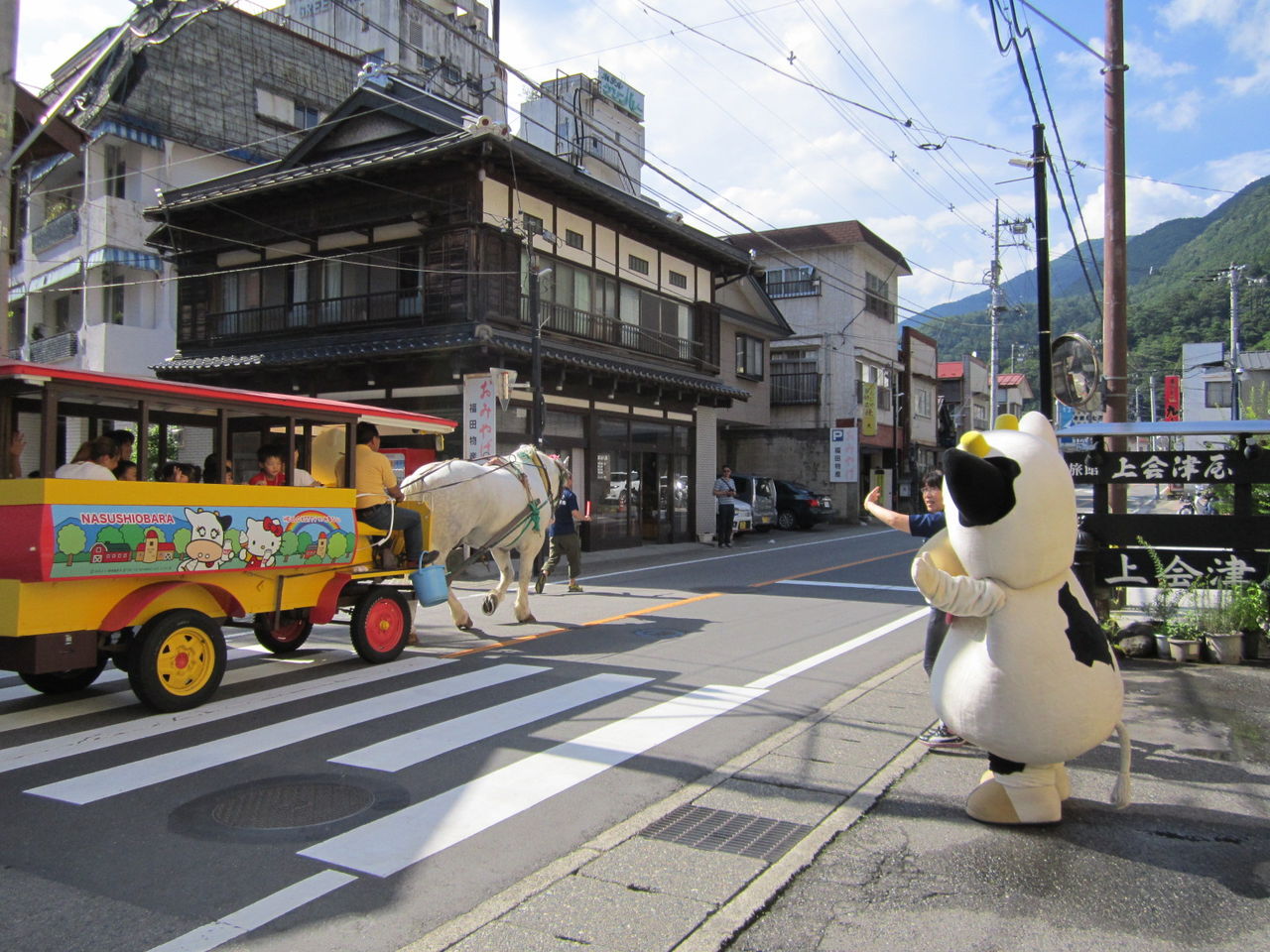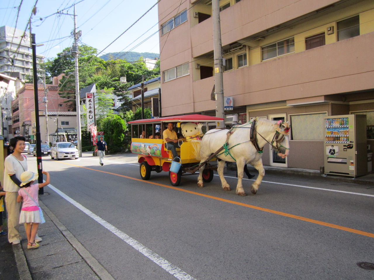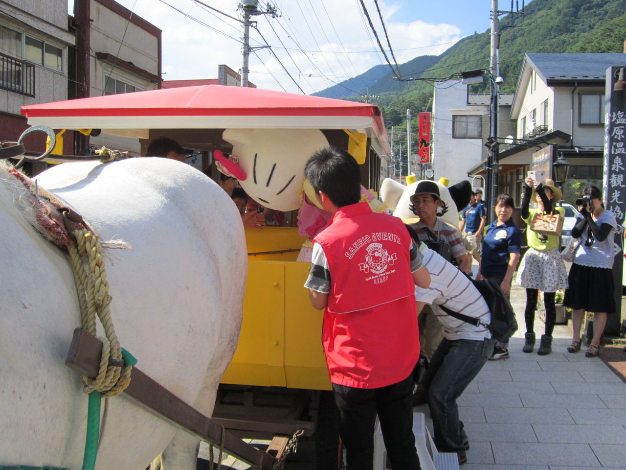 塩原名物『とて馬車』にキティちゃんが乗車し、温泉街を巡るのです。