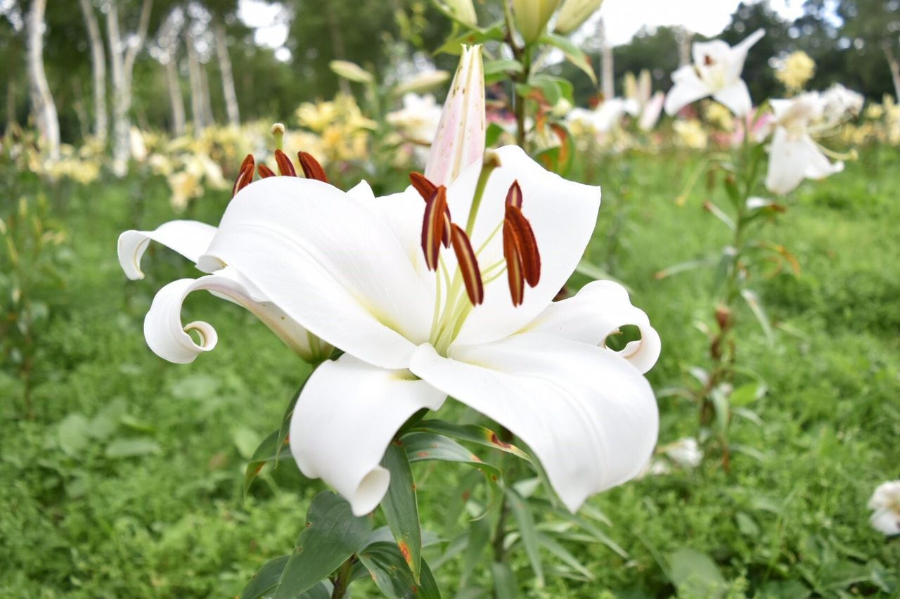 園内上部の白樺エリアがその絶好ポイントで、白樺の幹の白さと、まわりの草木の緑と、ゆりの花のカラフルな色合いがメルヘンな世界観を演出しているかのようでした。