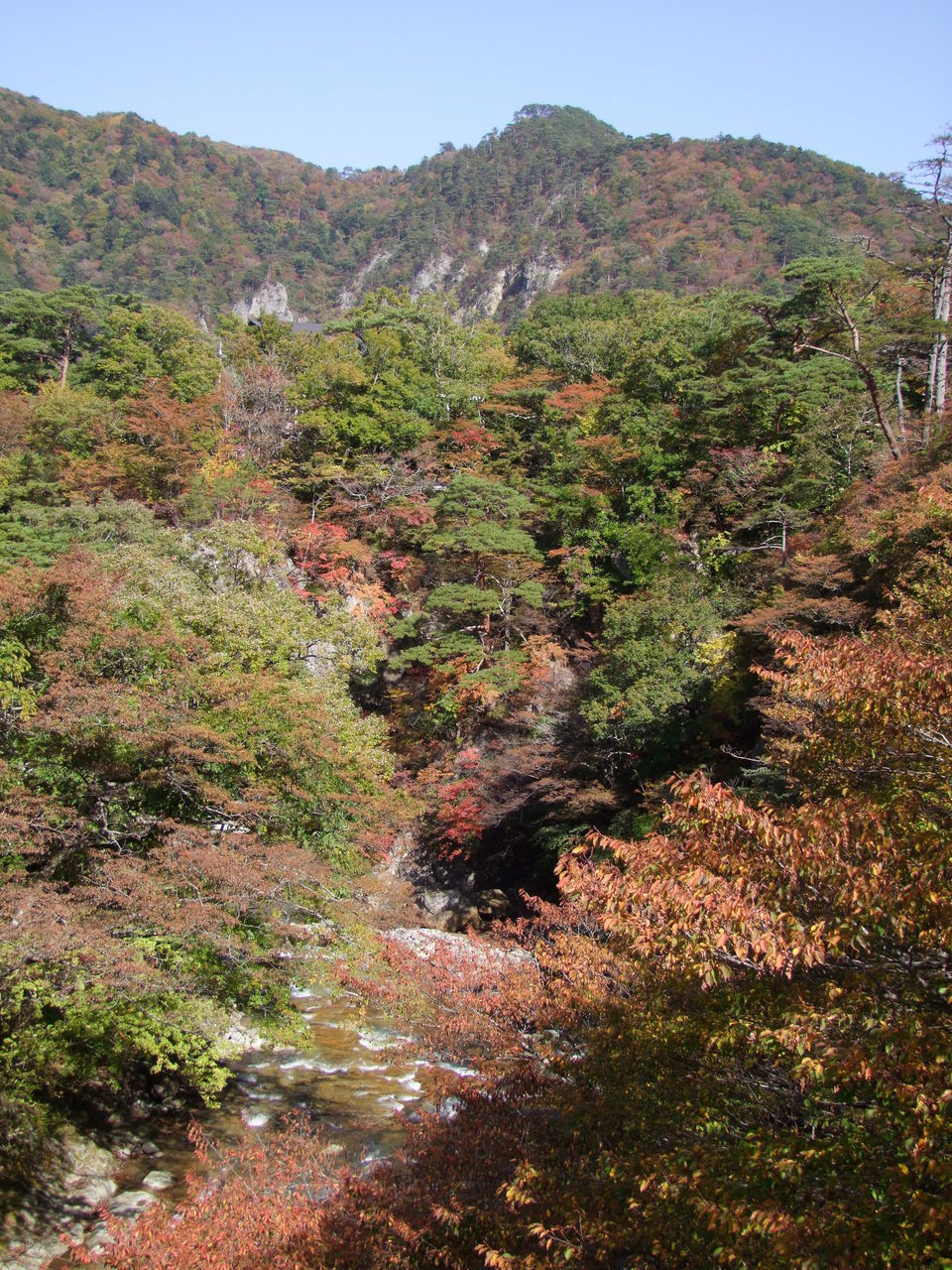 車を運転しながらの印象ですが、箒川の渓谷沿いも色が出てきたところがあちこちにありますよ。例えば、大網温泉と竜化の滝入口の間の国道400号沿いは、切り立った斜面にツツジが多く見られる場所ですが、全体的に赤みを帯びていてきれいです。「ここの様子を見ると、紅葉も見ごろを迎えたと言ってもいいんじゃないかな?」と思うのですが、渓谷全体でみるとまだ色づき始めですね。