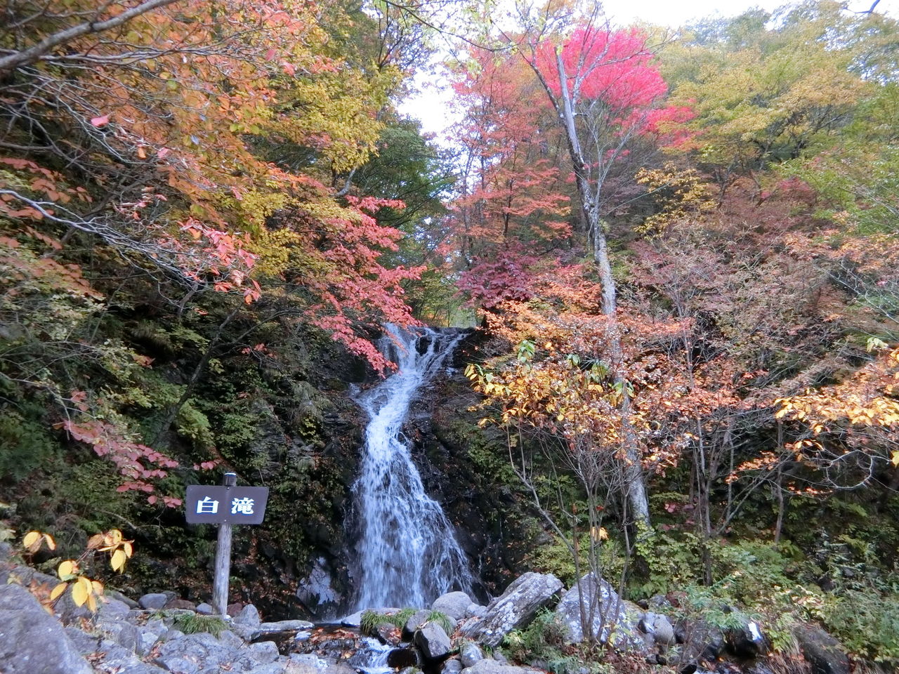 下の写真は、白滝の様子です。沢に沿って冷気が流れてくるのか、滝の周囲は紅葉が進み目を引くようになりました。ここを見ても、滝の周りは鮮やかですが、少し離れたところは緑の色味が強いように見えますね。