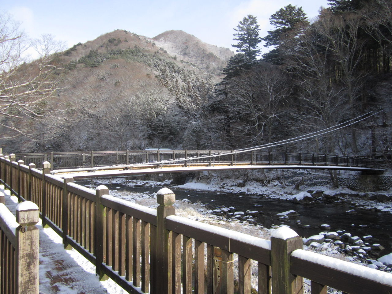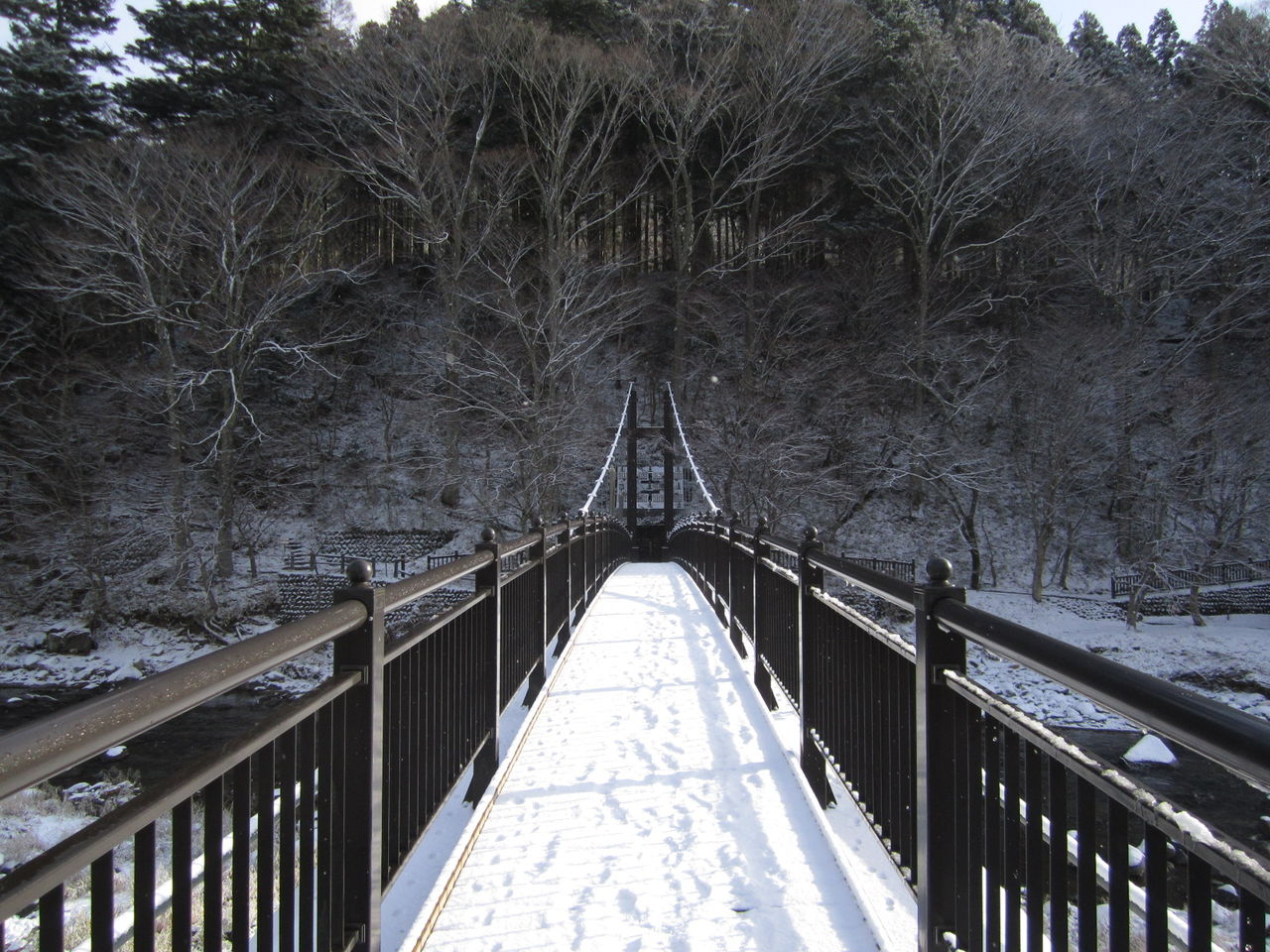 今シーズンはすでに何回か雪が降っていますが、写真の吊橋の近くにある『塩原もの語り館』ではこの冬初めての雪かきをしました。