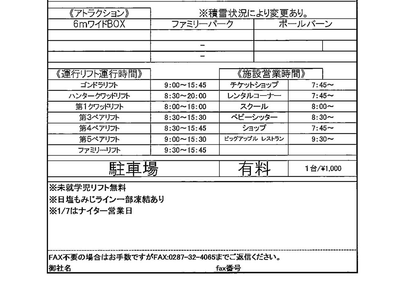リフトの運行時間や各施設の営業時間は上記のとおりです。