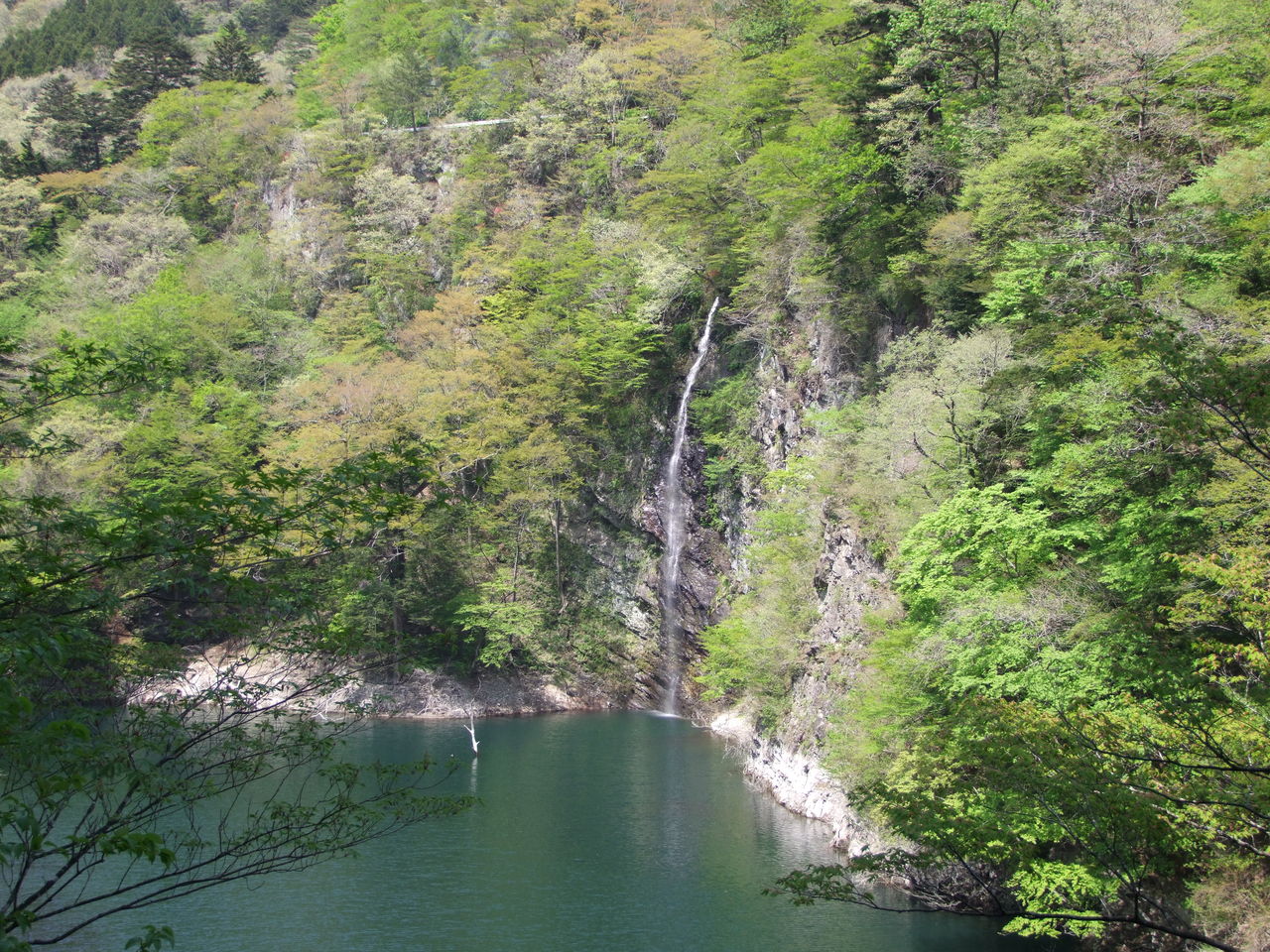 次の写真は、回顧の吊橋を渡ってからご覧いただくことができる「回顧の滝(みかえりのたき)」です。落差は53メートルほど。淡い緑の木々の間から流れ落ちていてとても美しいです。雨の日が少ないこともあり、水量が少なめですね。