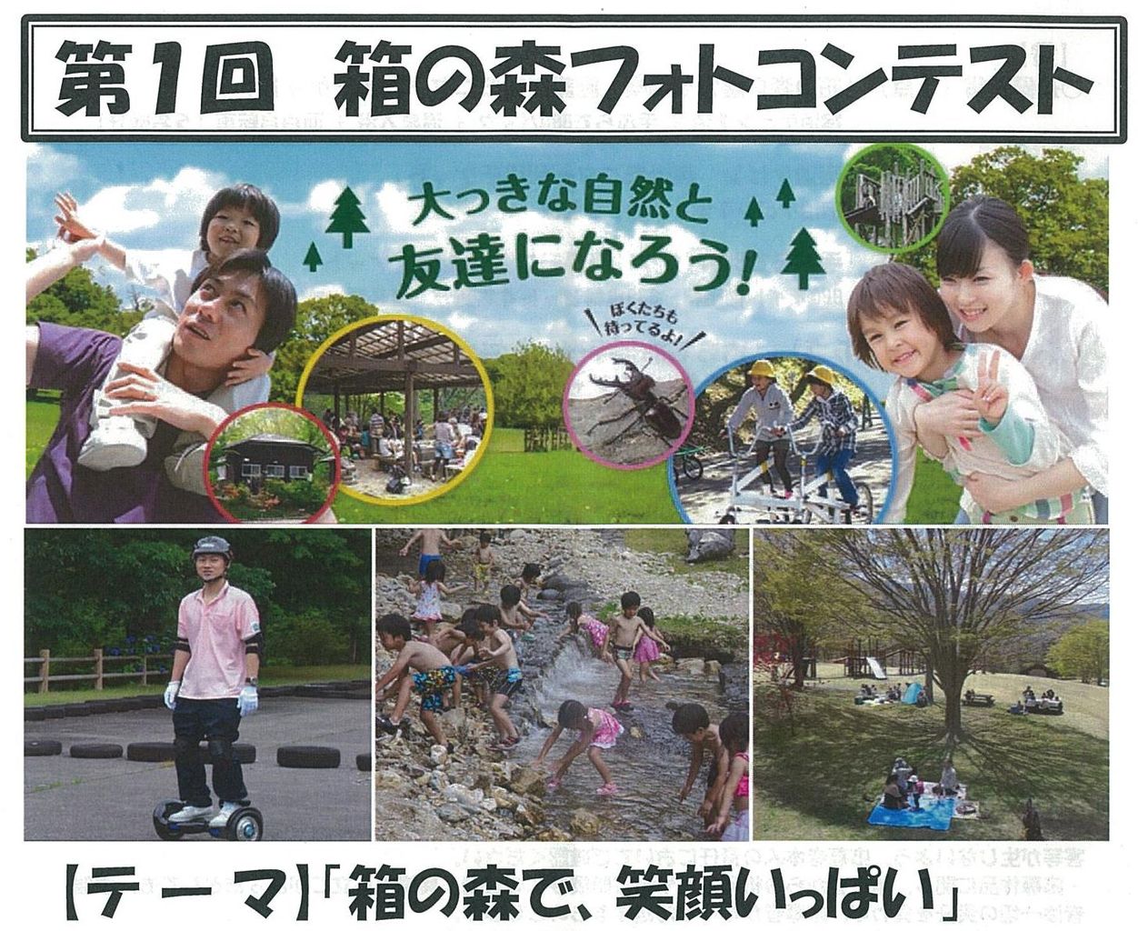 テーマは「箱の森で、笑顔いっぱい」・・・箱の森で遊んだり、大自然の中でくつろいでいる子供たちや家族の笑顔、風景を切り取った一コマを募集します。