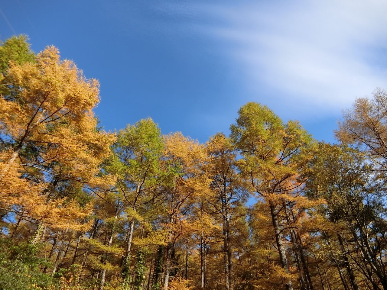 終点には車数台が止められる駐車場があります。ちょうど周囲はカラマツの黄葉が見事で、青空の下で黄金色に輝いて見えました。