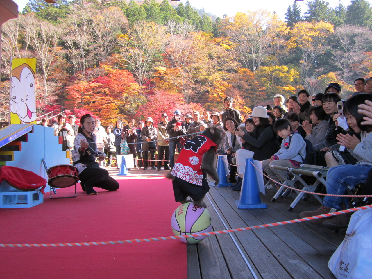 さて、真っ赤なもみじの名所である『紅の吊橋』付近ではさる回しのイベントがありました。