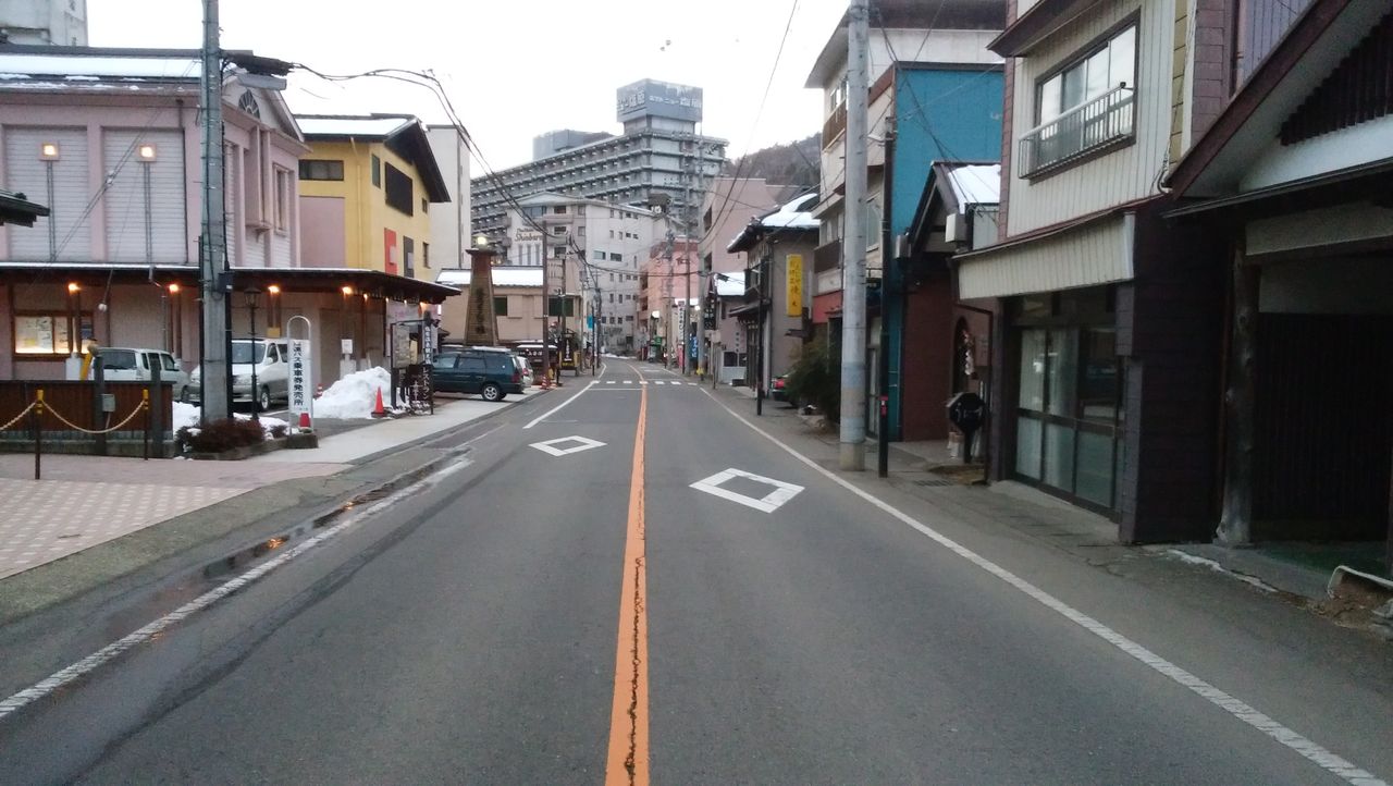 山の奥の方へ行く道は雪がありますが、温泉街はありません。