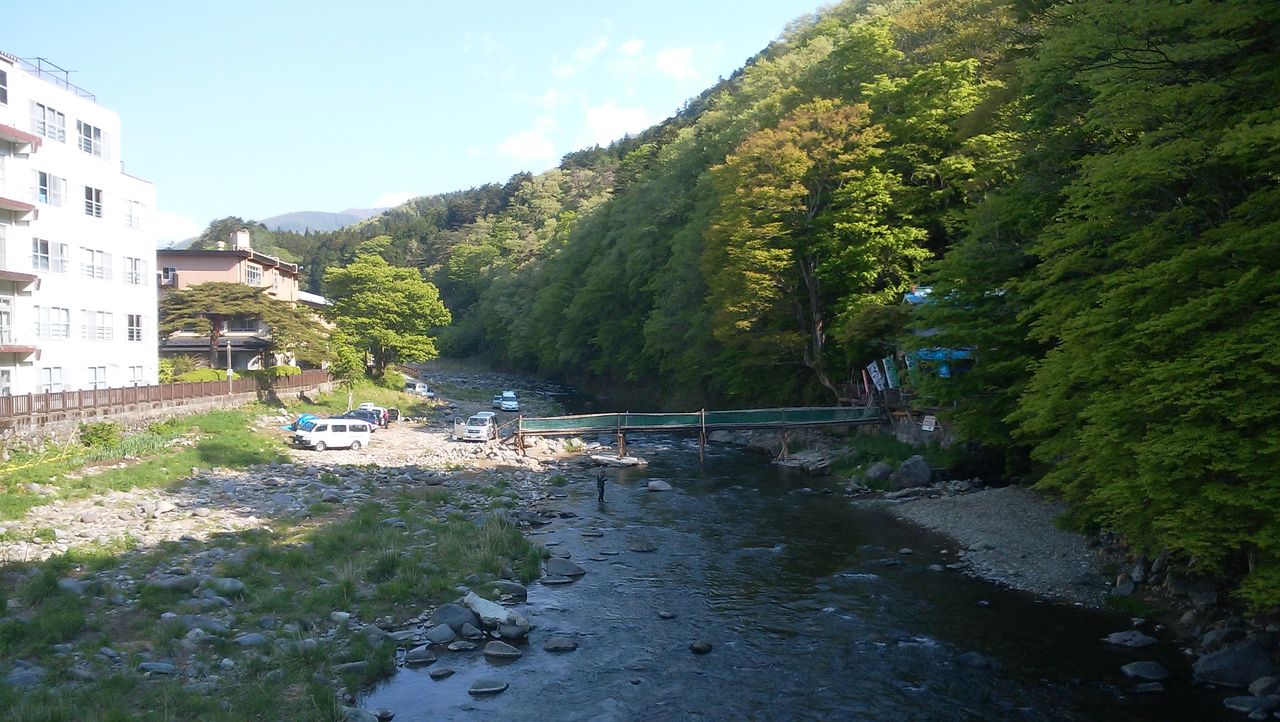 温泉街の中心地にある紅の吊橋から上流方向を撮りました。