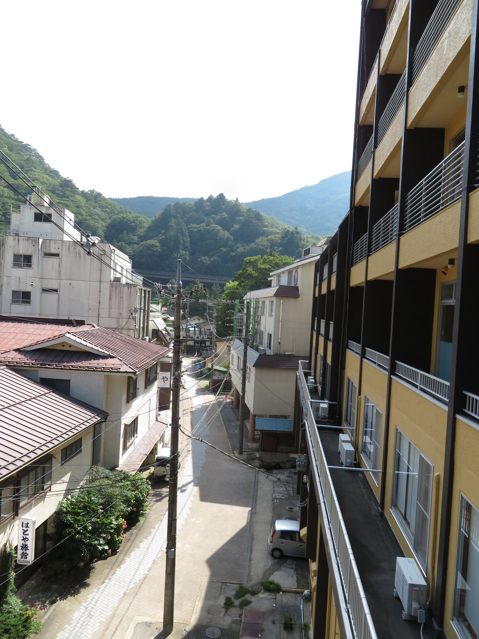 この作品は、「塩原畑下」昭和21年(1946)です。現在の写真と比べてみると、建物が高くなったり鉄筋化されたりしていますが、道路の形と両側の家並みなどの雰囲気はどことなく伝わると思います。