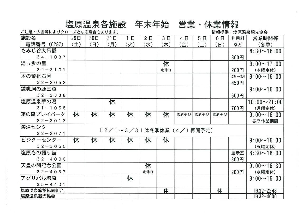 年末年始に塩原温泉へのお出かけを予定されているみなさんへ、観光施設の営業・休業の情報をお届けします。